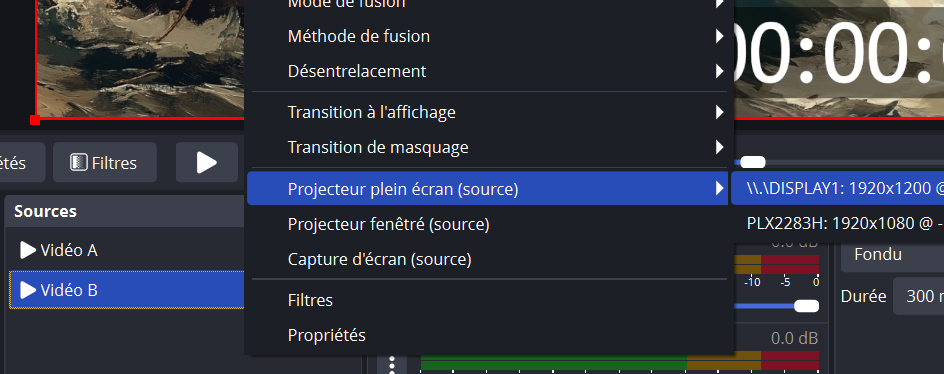 Dans la scène Films, faites un clic droit sur la source Vidéo B puis sélectionnez la sortie vidéo qui correspond à l’écran retour scène pour les musiciens.